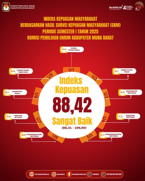 #TemanPemilih, Berikut Capaian Indeks Kepuasan Masyarakat, Hasil Survei yang dilakukan oleh KPU Kabupaten Muna Barat Semester I Tahun 2025 tentang pelayanan publik. Terima kasih Teman Pemilih yang telah berpartisipasi mengisi Survey Kepuasan Masyarakat semester I Tahun 2025. ???????????? #KPUMelayani ....