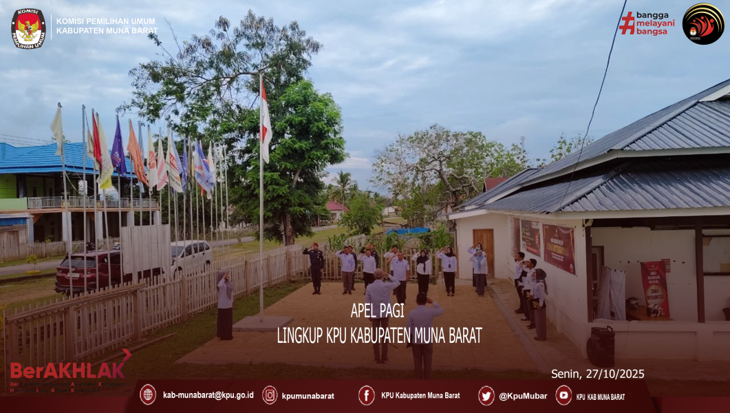 Kegiatan ini dilaksanakan setiap hari Senin dan merupakan kegiatan rutin dilingkup KPU Kabupaten Muna Barat sebagai salah satu cerminan peningkatan kedisiplinan seluruh jajaran KPU Kab. Muna Barat dan di Seluruh jajaran KPU dari Komisioner dan Pegawai Sekretariat tetap konsisten dalam menjalankan tugas-tugas Rutinnya.