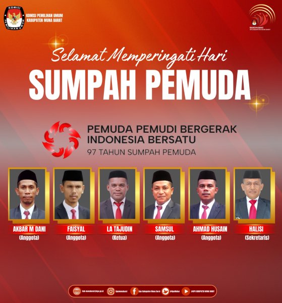 #TemanPemilih Komisi Pemilihan Umum Kabupaten Muna Barat mengucapkan Selamat Hari Sumpah Pemuda Ke 97 "Pemuda Pemudi Bergerak Indonesia Bersatu" 28 Oktober 2025.