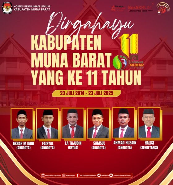 #Temanpemilih,, Segenap Keluarga Besar KPU Kabupaten Muna Barat Mengucapkan Dirgahayu Kabupaten Muna Barat yg ke 11 Tahun , dengan Tema Harmoni Mubar Liwu Mokesa Tumbuh - Sehat - Keren.