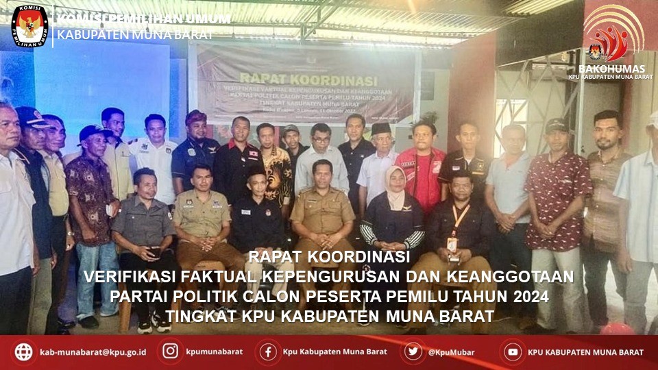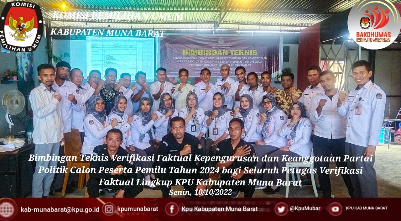 Dalam Arahannya Anggota KPU Provinsi Sulawesi Tenggara, Iwan Rompo Banne menyampaikan bahwa KPU Kabupaten/Kota termasuk KPU Kabupaten Muna Barat, akan melaksankan Verifikasi Faktual mulai tanggal 15 Oktober 2022 s/d 4 November 2022. Tahapan Verifikasi Faktual terbagi menjadi dua tahapan, yaitu tahapan verifikasi Faktual Kepengurusan yang akan dilaksanakan mulai tanggal 15 – 17 Oktober 2022 dan Tahapan Verifikasi Faktual Keanggotaan yang akan dilaksanakan mulai tanggal 18 Oktober 2022 s/d 4 November 2022.
