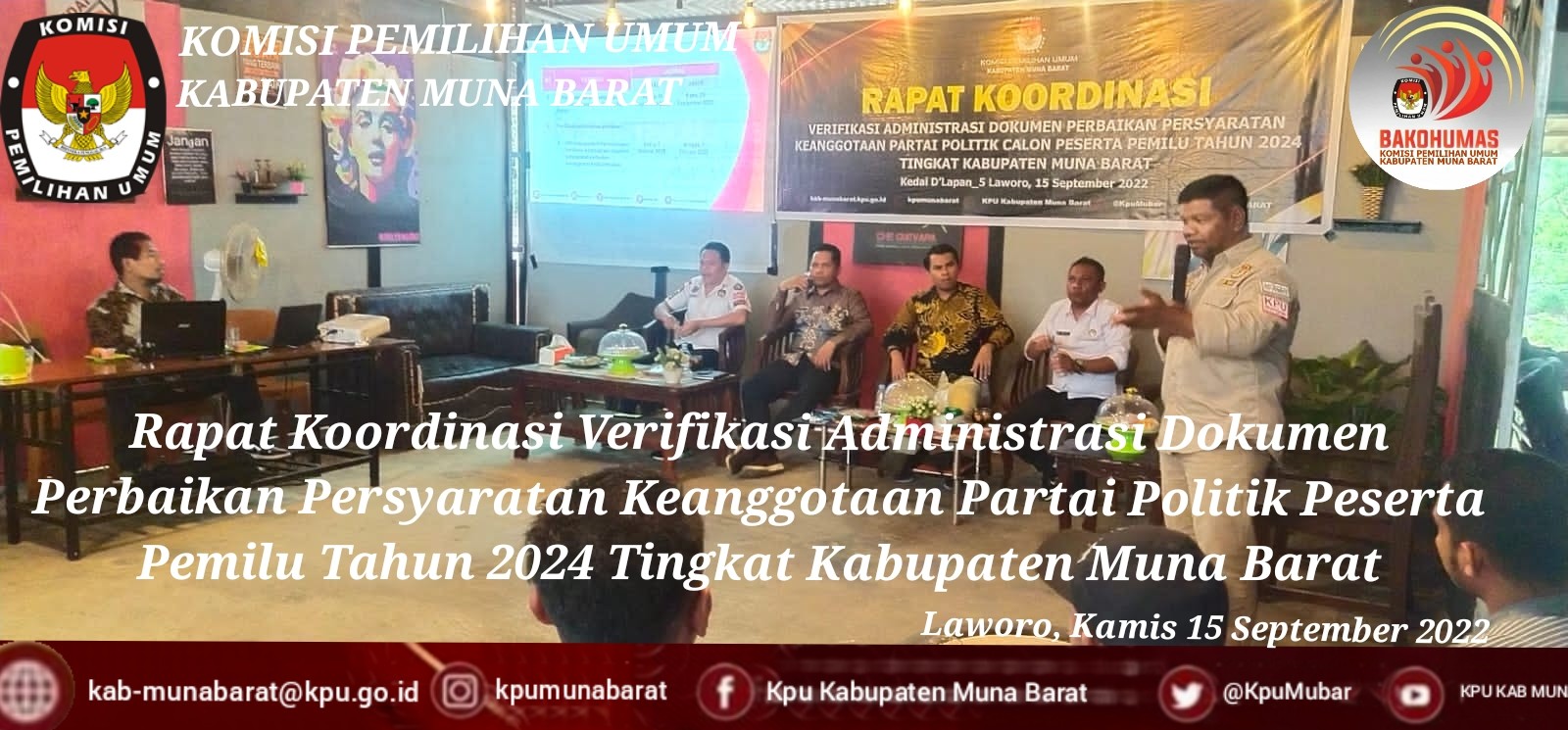Bakohumas KPU Kabupaten Muna Barat.#TemanPemilih,KPU Kabupaten Muna Barat melaksanakan Kegiatan Rapat Koordinasi Verifikasi Administrasi Dokumen Perbaikan Persyaratan Keanggotaan Partai Politik Calon Peserta Pemiliu Tahun 2024 Tingkat Kabupaten Muna Barat pada tanggal 15 September 2022 bertempat di Kedai_Delapan’5 - Laworo