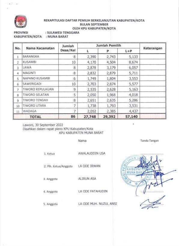 La Ode Irwan, Anggota KPU Kab. Muna Barat yang membidangi Divisi Teknis Penyelenggaraan dalam pemaparan nya dihadapan seluruh peserta Rapat Koordinasi menyatakan bahwa semua Partai Politik di tingkat Kabupaten Muna Barat, masih ada status anggota nya yang Belum Memenuhi Syarat dan Tidak memenuhi syarat. Pada Rabu tanggal 14 September 2022, KPU RI telah menyampaikan hasil verifikasi Administrasi kepada masing-masing Pimpinan Partai Politik di tingkat Pusat. Seperti telah diketahui bersama bahwa ada 24 Partai Politik yang diterima Pendaftaran nya oleh KPU RI dan berdasarkan Akun SIPOL KPU Kab. Muna Barat, semua Partai politik yang terdaftar di KPU RI, juga terdaftar di Kabupaten Muna Barat.
