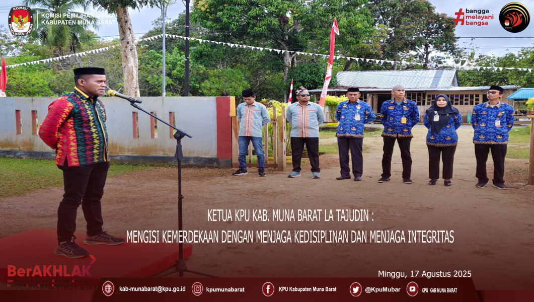 Komisi Pemilihan Umum Kabupaten Muna Barat melaksanakan Upacara Peringatan Hari Ulang Tahun ke - 80 Kemerdekaan Republik Indonesia dengan tema " Bersatu, Berdaulat Rakyat Sejahtera, Indonesia Maju". Dihalaman Kantor KPU Kabupaten Muna Barat pada Minggu (17/8/2025).
