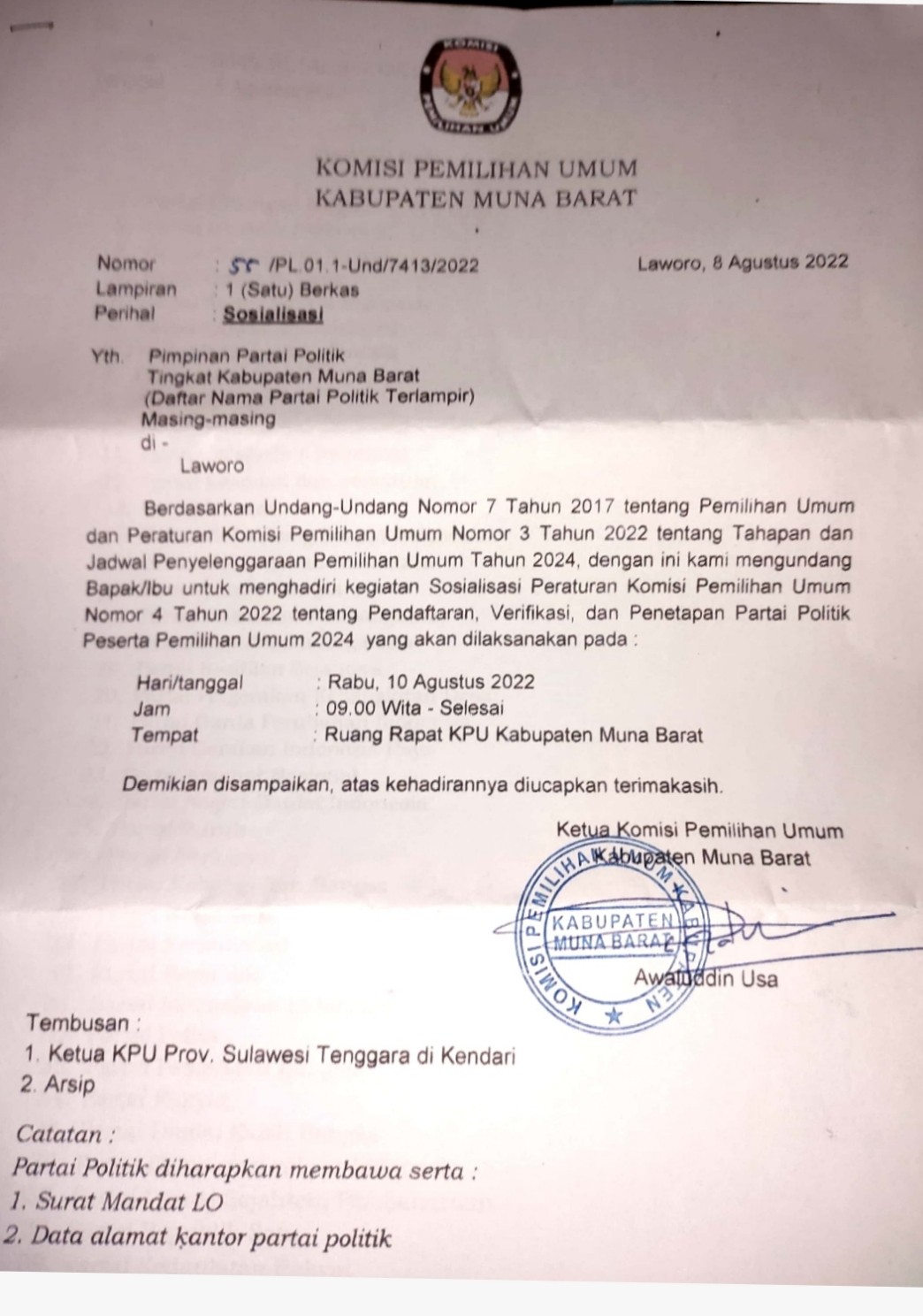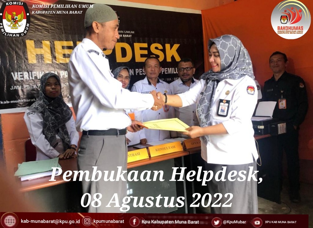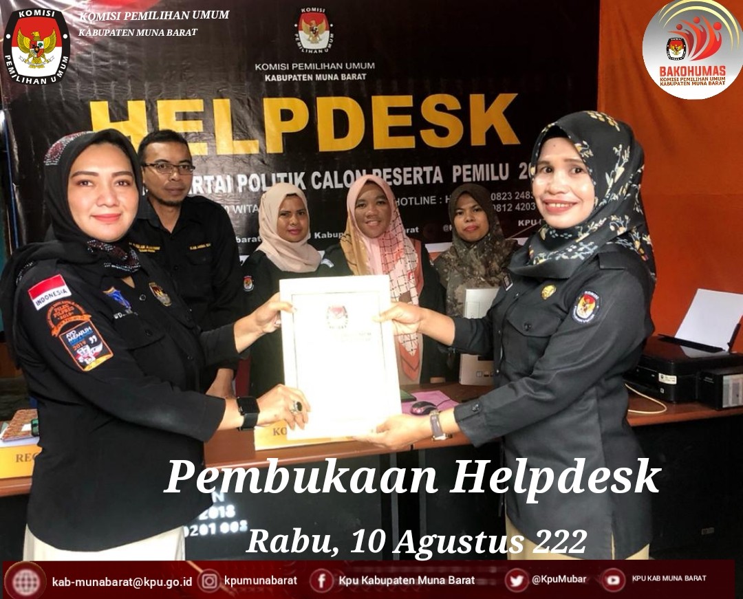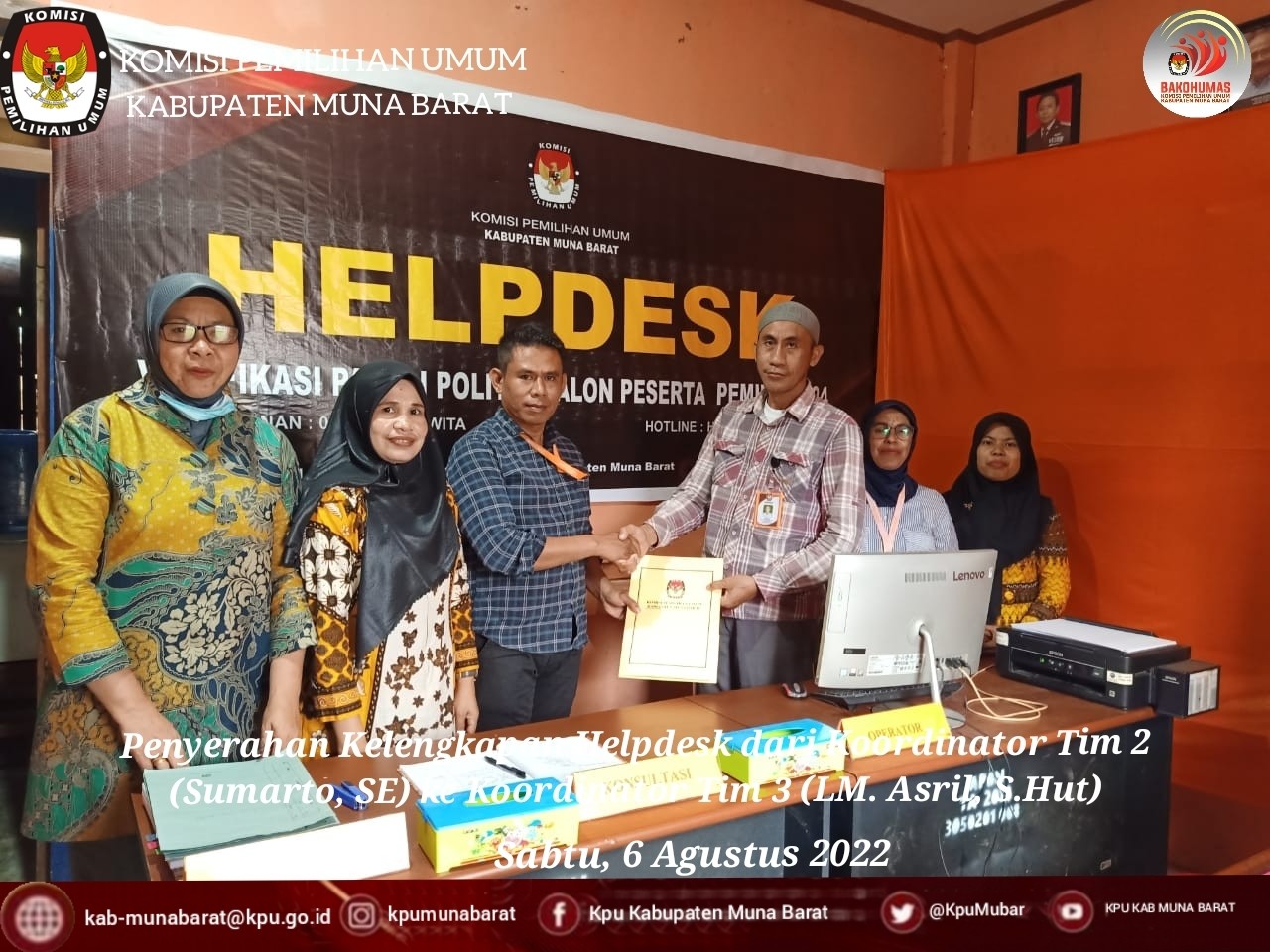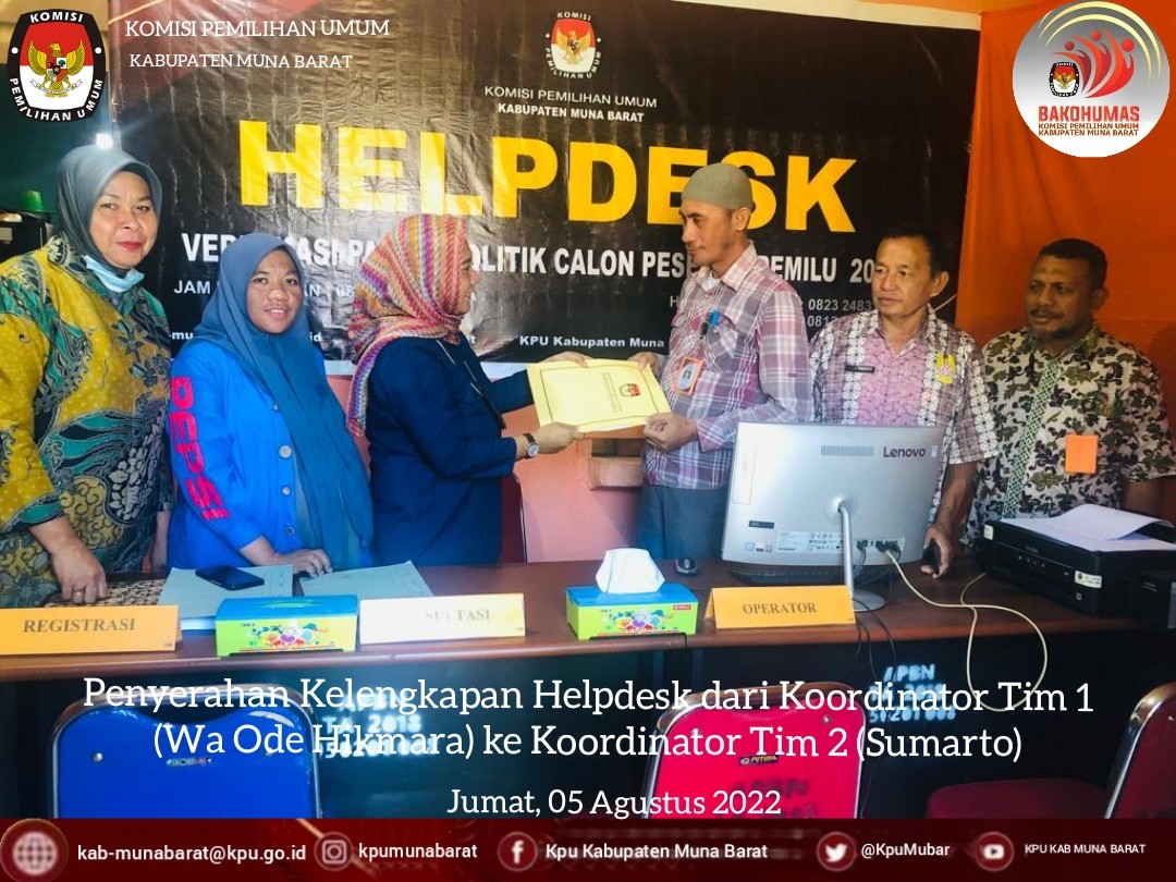 Bakohumas KPU Kabupaten Muna Barat.#TemanPemilih,, 5 Agustus 2022 Di ruang Helpdesk Pendaftaran, Verifikasi dan Penetapan Partai Politik Calon Peserta Pemilu Tahun 2024 di Kantor KPU Kab.Muna Barat Pukul 08.00 telah dilaksanakan Kegiatan Penyerahan Kelengkapan Helpdesk dari Koordinator Tim 1 ( Wa Ode Hikmara, SP, MM) ke Koordinator Tim 2 (Sumarto, SE)