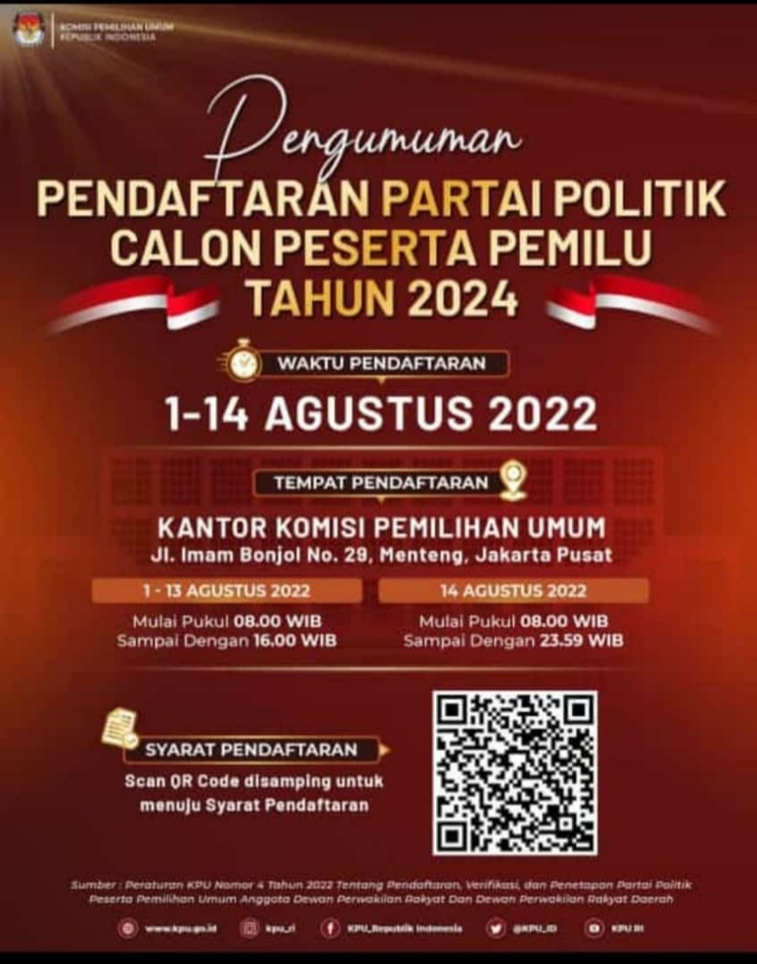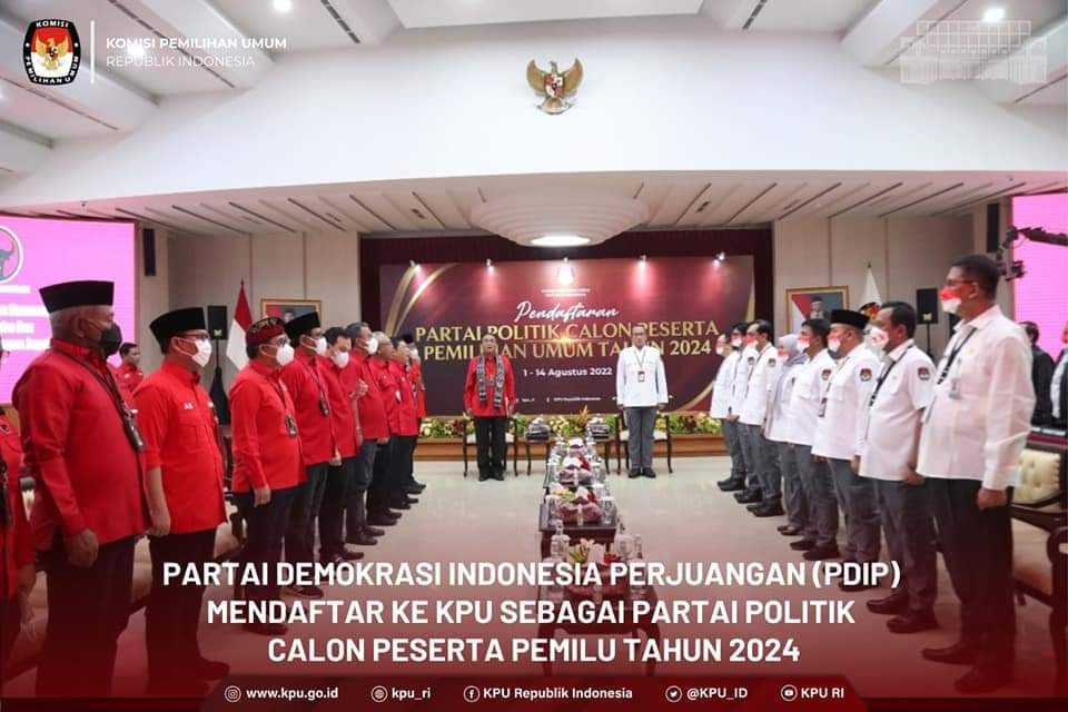 #TemanPemilih, Partai Demokrasi Indonesia Perjuangan (PDIP) mendaftar sebagai Partai Politik Calon Peserta Pemilu Tahun 2024, Senin (1/8/2022) di kantor KPU. Pendaftaran dilakukan oleh Pimpinan Dewan Pimpinan Pusat (DPP) PDIP, Bambang Wuryanto didampingi Sekjen PDIP, Hasto Kristiyanto serta fungsional partai Arif Wibowo, dan Ahmad Basarah pada pukul 07.56 WIB.