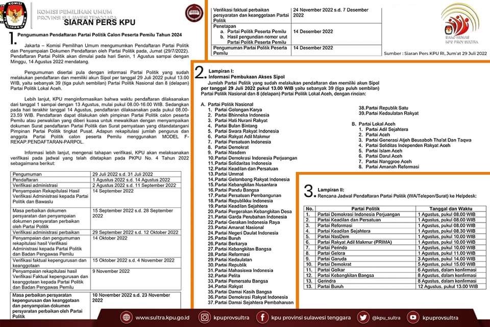 Delegasi partai disambut oleh Sekretaris Jenderal KPU Bernad Dermawan Sutrisno, didampingi Deputi Bidang Dukungan Teknis Eberta Kawima, dan diterima oleh Ketua KPU Hasyim Asy'ari, Anggota KPU Idham Holik, August Mellaz, Mochammad Afifuddin, Betty Epsilon Idroos, Yulianto Sudrajat dan Parsadaan Harahap, serta disaksikan oleh Bawaslu RI.
