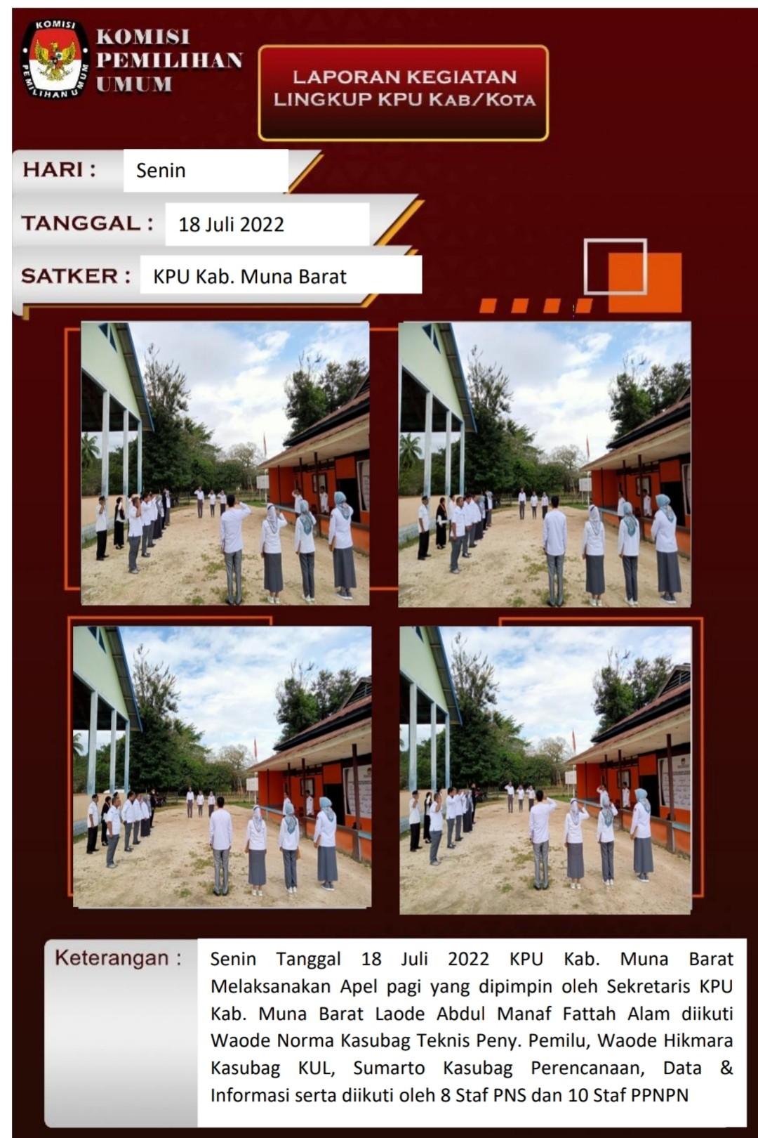 #TemanPemilih,Mengawali kegiatan Senin pagi KPU Kabupaten Muna Barat melaksanakan Apel Pagi Rutin di Halaman Kantor KPU Kabupaten Muna Barat (18/07/2022).
