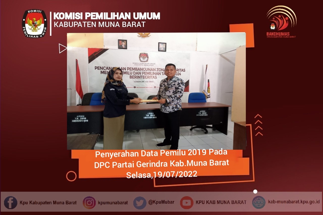 Kepada Pengurus DPC Partai Gerindra Kab.Muna Barat.Penyerahan dokumen ini berdasarkan Surat Ketua DPC Partai Gerindra Kab.Muna Barat Perihal Permintaan Data Hasil Pemilu 2019.