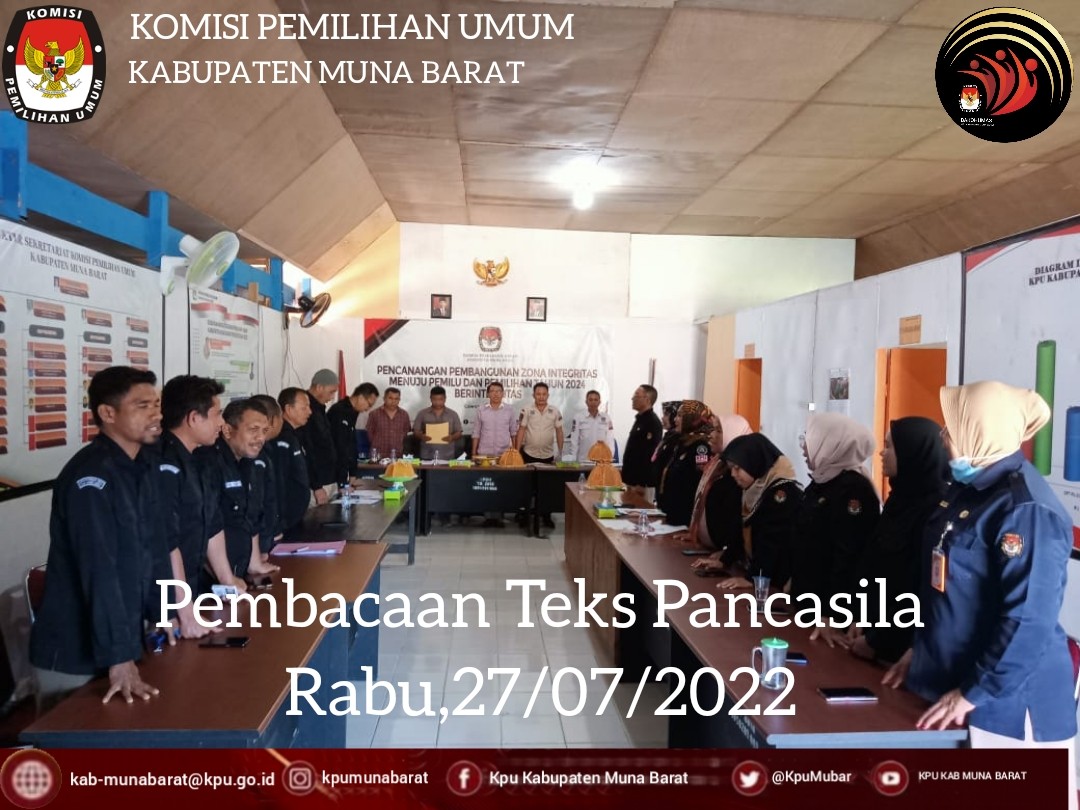 Hai #Temanpemilih,, KPU Kab. Muna Barat melakukan kegiatan rutin setiap hari Rabu (27/07/2022) yaitu Pembacaan Teks Pancasila, diikuti oleh Ketua KPU, Anggota KPU, Sekretaris , Kasubag dan Staf Sekretariat KPU Kab. Muna Barat.