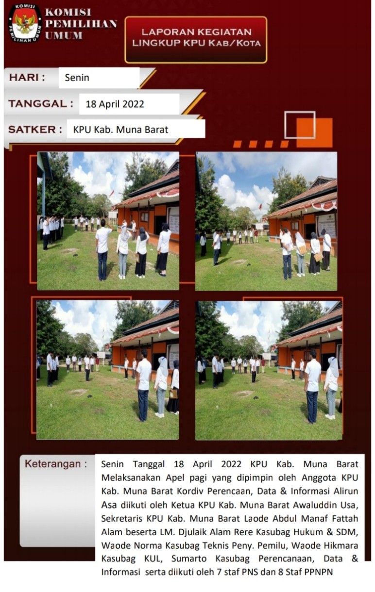 Hai #TemanPemilih,,KPU Kab.Muna Barat melaksanakan Apel Pagi dipimpin oleh Kediv Perencanaan,Data dan Informasi (Alirun Asa),diikuti oleh Sekretaris,Kasubag dan Staf jajaran Sekretariat KPU Kab.Muna Barat,(Senin,18/04/2022).