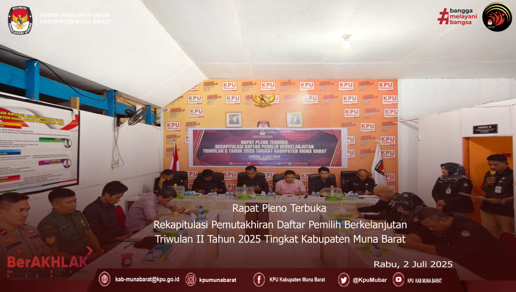 Komisi Pemilihan Umum Kabupaten Muna Barat Melaksanakan Rapat Pleno Terbuka Rekapitulasi Pemutakhiran Data Pemilih Berkelanjutan PDPB Triwulan II Tahun 2025, Di Aula KPU Kab. Muna Barat, Rabu 2 Juli 2025.